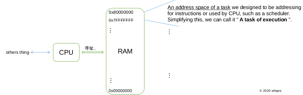 其次,全部任务的数据都在这块RAM里交杂堆着,很难管理,一个任务也可以随意访问RAM中别的任务的地址,程序员一个错误,一个很可能就把别的任务给干掉了,其中最要紧的就是在同一片RAM地址运行的调度算法了,不过,我们可以设计一个内存访问逻辑,即访问前先判断该地址(是否可用?是否被标记占用了?占用者是谁?可否抢来用?)然后再决定实际的内存操作,我们给它命名为内存权限访问机制。 现在,我们写入的任务(我们暂命名为task),即CPU要执行的内容,在RAM里简化看是这样的: