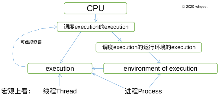现在对于应用程序而言,它们只有假的地址空间(编号),这一个独立的虚拟的地址空间和绑定于此的执行任务形成的整体是一个等待或正在处理/进行中的一个任务队列,而里面又有真正意义上的一个或多个执行队列即execution(s)。明显地,现在前者被命名为了“Process” - ”A procees that operate on (computer data) by means of a program“,后者被命名为了“Thread” - “A thread of a execution within a process“。